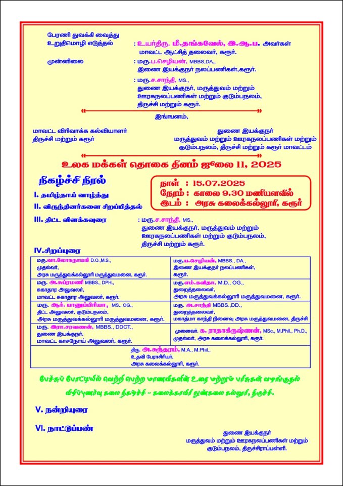 உலக மக்கள் தொகை தினத்தை முன்னிட்டு, அரசு கலைக்கல்லூரி (தன்னாட்சி), கரூர், தன்னுடைய தேசிய சேவை திட்டம் (NSS) பிரிவின் சார்பில் ஒரு விழிப்புணர்வு பேரணியை சிறப்பாக நடத்தினது.
