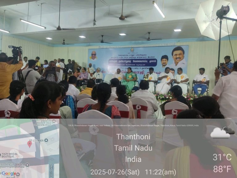 கரூர் மாவட்ட நிர்வாகம், தமிழ்நாடு மாநில ஊரக நகர்ப்புற வாழ்வாதார இயக்கம், கரூர் மாவட்ட வேலைவாய்ப்பு மற்றும் தொழில்நெறி வழிகாட்டும் மையம் இணைந்து இன்று (26-07-2025-சனிக்கிழமை) நமது அரசு கலைக் கல்லூரி (த), கரூர் -5.-ல் நடத்திய மாபெரும் தனியார்துறை வேலைவாய்ப்பு முகாமில் கரூர் மாவட்ட ஆட்சியர், கரூர் மாநகராட்சி மேயர், துணை மேயர் உள்ளிட்ட பெருமக்கள் கலந்து கொண்டு தேர்வு பெற்ற இளைஞர்களுக்கு பணி ஆணையினை வழங்கி வாழ்த்தினர்.