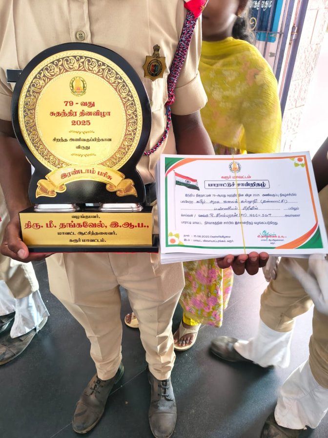 கரூர் மாவட்ட விளையாட்டு அரங்கில் இன்று(15.08.2025) நடைபெற்ற சுதந்திரதின அணிவகுப்பில் பங்கேற்று நம் கல்லூரி தேசிய மாணவர் படை வீரர்கள் இரண்டாம் இடம் பெற்று மாவட்ட ஆட்சியரிடம் இருந்து பரிசுக் கோப்பையையும் சான்றிதழ்களையும் பெற்று கல்லூரிக்குப் பெருமை சேர்த்துள்ளனர் என்பதை மகிழ்ச்சியுடன் தெரிவித்துக் கொள்கிறேன்.